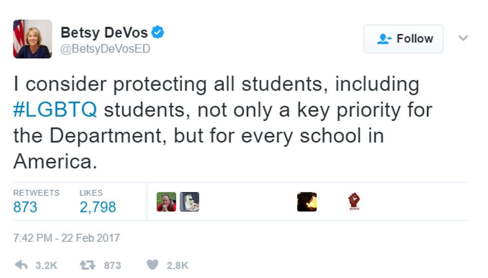 In Wednesday's post, we also reported that Education Secretary Betsy DeVos had surprisingly fought against Attorney General Jeff Sessions's deep and abiding desire to hurt LGBT people, that she didn't want to go along with the Trump regime's order, and that she had pushed for it to have more inclusive language. It was a pleasant surprise to hear! It's not like we now think DeVos is going to be a good Education secretary or anything, but we're glad to learn she may not be the raging bigot the rest of her family is on LGBT issues.