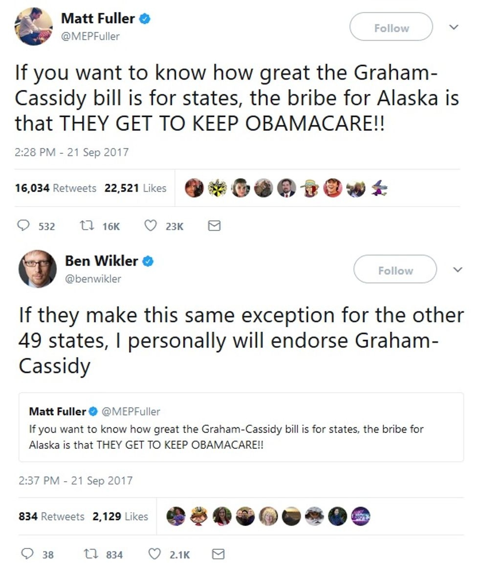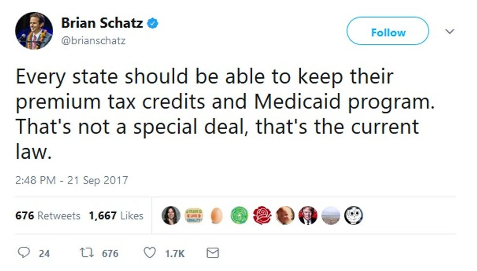 If one of these new Alaska Purchases actually turns out to be in the version of the bill that gets voted on Wednesday, it's pretty much an admission that the only way Republicans can induce a reluctant senator to vote for killing Obamacare is to let her state keep Obamacare, at least for a while. (Oh, it also might be unconstitutional. ) The irony did not go unnoticed. Brian Schatz, Democratic Senator from Hawaii, wasn't moved by the offer to let his state (which often -- but doesn't always -- votes with Alaska because they're last-state buddies), not one bit: