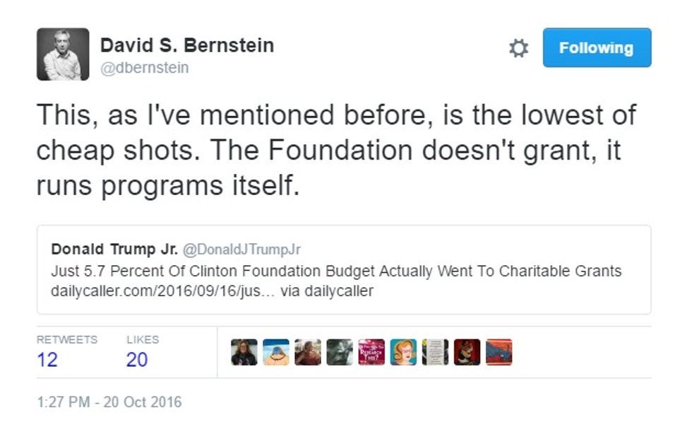 Now, we should probably mention some Flat Out Bullshit, as found in "fact checks" by Breitbart and the Daily Caller, which both claim the Clinton Foundation only donates a tiny percentage of its budget in grants to other charities. This is a beautiful example of lying with statistics: The Clinton Foundation runs its own programs, giving direct medical and other aid to people in need, so the percentage of grants it gives to other charities is irrelevant. Not that it kept Donald Trump Jr. from using one of those stories for the sake of a cheap shot.