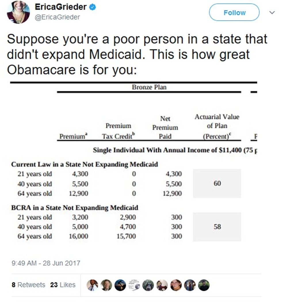 Among other particulars in Grieder's follow-up argument about the good stuff in the Better Not Believe We Care plan is this explanation of why it would be way better for poor people than Obamacare, at least in states that rejected the expansion (we've embiggened the table in the tweet to make it more readable):