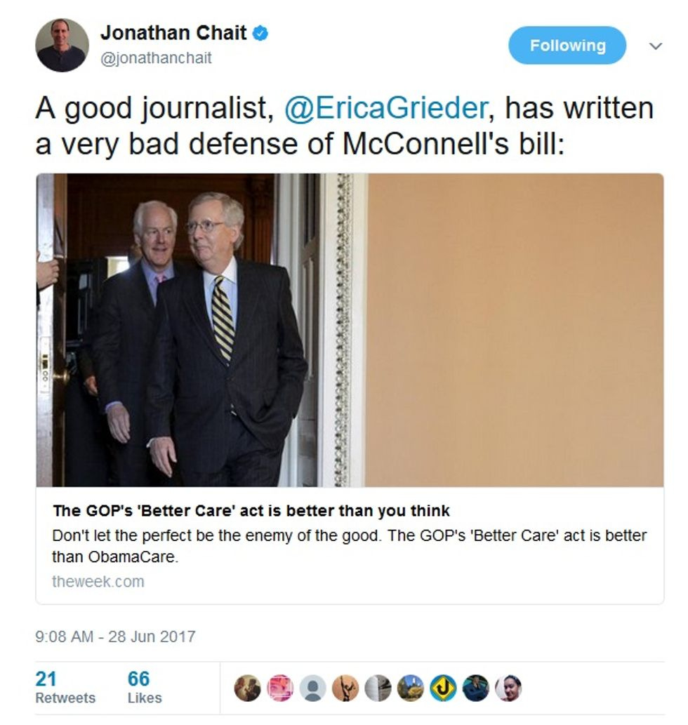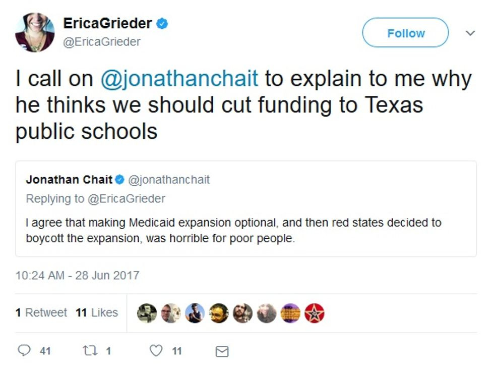 The arguments about TrumpCare are getting weird, folks. Over at The Week, Texas Monthly editor Erica Grieder published a strange column arguing that the Senate's Better Not Need Care bill is really much, much better than most people think it is, because lots of reasons. While we didn't find the argument convincing, we won't really get into it here, since the column itself isn't our main concern, but rather the Twitter fight Grieder subsequently got into with New York magazine's Jonathan Chait, who this morning Twote thusly: