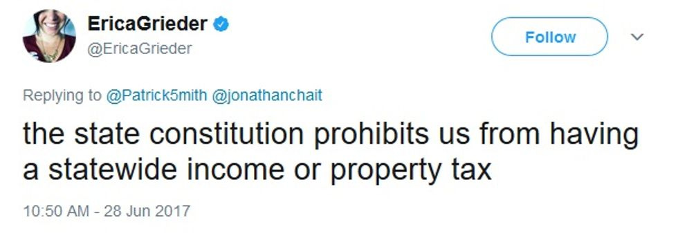 Which certainly gives us insight into Texas's stupid priorities, but also missed the point, since Medicaid expansion, you may recall, came with over 90% of its costs covered by the federal government until 2022. So that really seems like a stretch -- we're not sure Grieder has both either-ors in the water there. Also, as others pointed out, if Texas had the will to really help its children and its poor people (which of course is ridiculous; it's Texas ), the state constitution does allow for instituting a state income tax via a referendum, not that such a thing would ever pass.