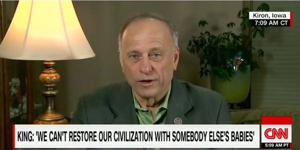 King is attempting to pretend he never said "white nationalist" or "white supremacist." He was just politely dog-whistling "Dixie" about the glories of "Western civilization," which can include people of all races, even the subhuman ones.