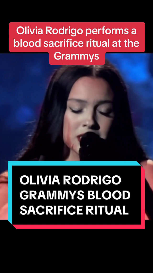 “That is blood on her face and on her chest. this girl was the littlest and most innocent thing in the world just like seven minutes ago and now she’s standing up on stage at the Grammys … rubbing blood on her face, singing about a demonic vampire sucking the blood out of her. This is her sacrifice ritual. This is the end of Olivia Rodrigo. She’s gone to the dark side, she’ll be in rehab in five years and THERE’S BLOOD POURING OUT OF THE FUCKING WALLS LIKE THE FUCKING BUILDING JUST HAD ITS FUCKING PERIOD.