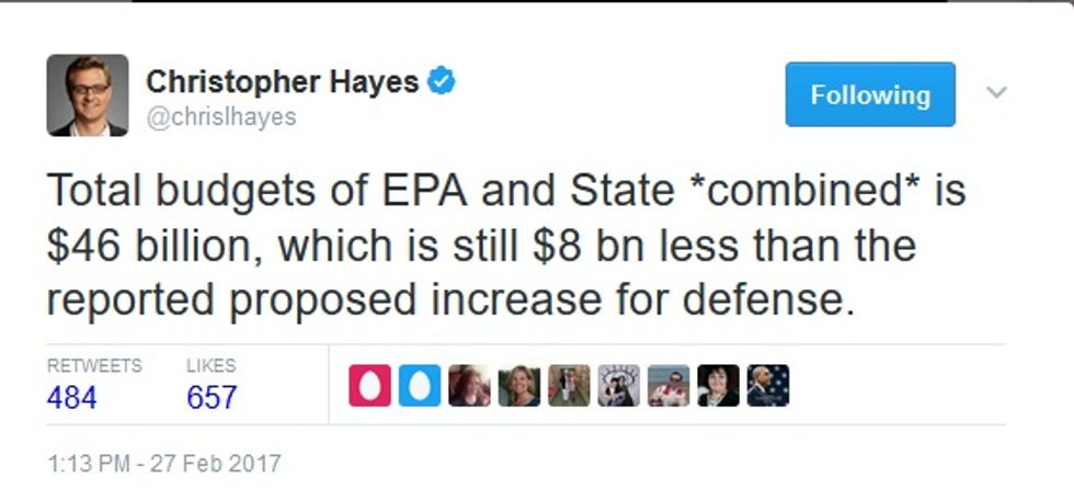Donald Trump knows math real good, so his budget plan, which he'll presumably roll out during Tuesday's address to a joint session of Congress -- unless he goes off-prompter and spends the whole thing yelling at the press and re-living every moment of the 2016 election -- promises a fantastic military buildup and corresponding cuts in everything else. The proposal for a $54 billion military increase comes even before any consideration of the enormous tax cuts Trump also wants, but don't worry, we can afford that too because whenever you cut government revenue, the economy grows so much government revenue actually goes up, just like it never did during the Reagan and Bush II administrations.