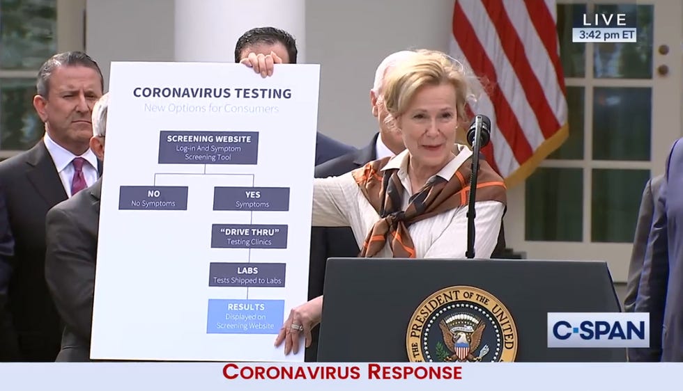 3: 39:Now Dr. Deborah Birx, who's been on Trump's coronavirus "task force," such as it is, is talking. She starts by pretending one of the good ideas they have implemented came from Trump's brain. Gotta kiss the ring!