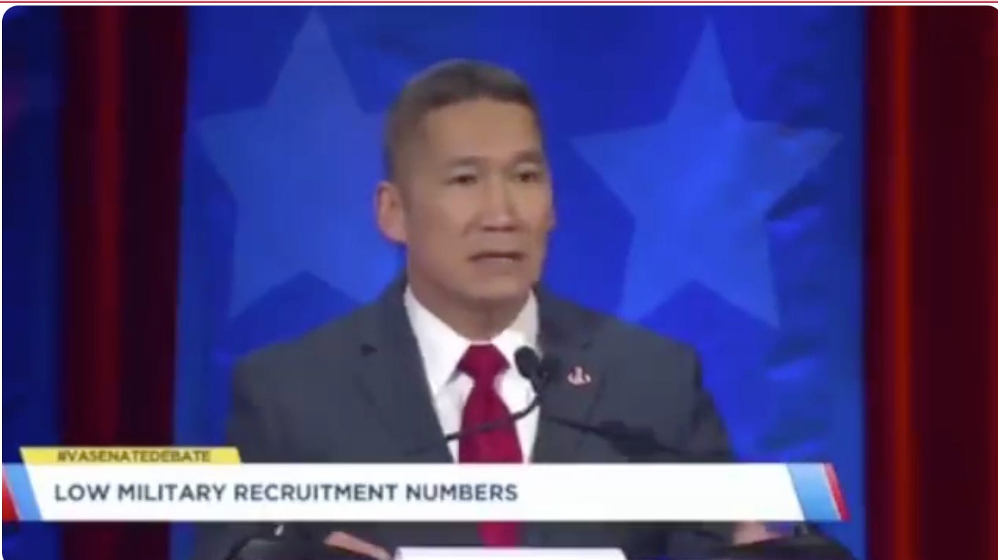 This is Hung Cao, who is running against Senator Tim Kaine in Virginia. Robyn told you a bit about him this summer when he said that one of his biggest priorities as senator would be to free Virginia of all these witches.