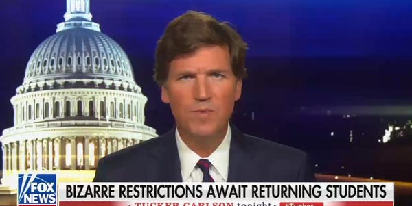 TUCKER CARLSON: Many schools that do plan to reopen will do so under a series of restrictions that have no basis of any kind in science. It's a kind of bizarre health theater. Students will be kept six feet apart, everyone will have to wear a mask, class size will be limited and in some there will be scheduled bathroom breaks, et cetera, et cetera.
