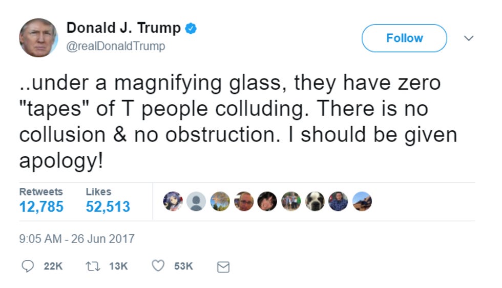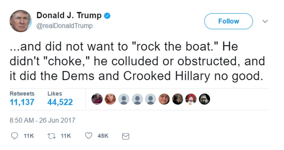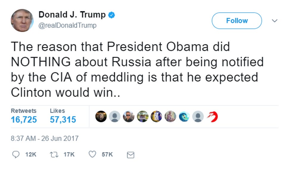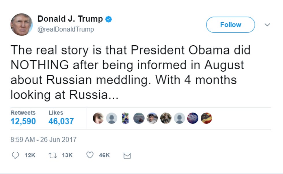 Anyway, two things. First of all, it's nice to see that Trump is finally admitting, even if he's saying "probably," that Russia did the meddling. He of course finally admitted this because Barack Obama tricked him -- it was a Jedi Mind Trick, according to Joe Scarborough! -- by being the main character in a major Washington Post investigation on the Obama administration's handling of the Russian election interference. The second Trump could blame Obama for the Russian hacking, he immediately and accidentally admitted on Twitter that yeah, Russia did it. Poor Trump's premature ejaculations are nothing if not predictable.
