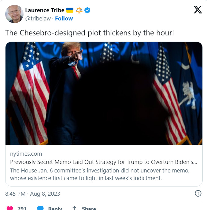 By the way, one of the Democrats cited in the memo is Harvard professor Lawrence Tribe, who Haberman et al. explain used to teach Chesebro. Tribe has been meanwhile explaining lately that his former student is full of shit.