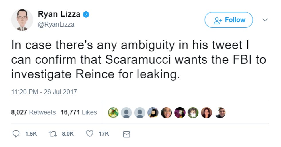 . @Scaramucci on WH Chief of Staff Priebus: "If Reince wants to explain that he's not a leaker, let him do that." https: //t.co/H7s5SzqeOa