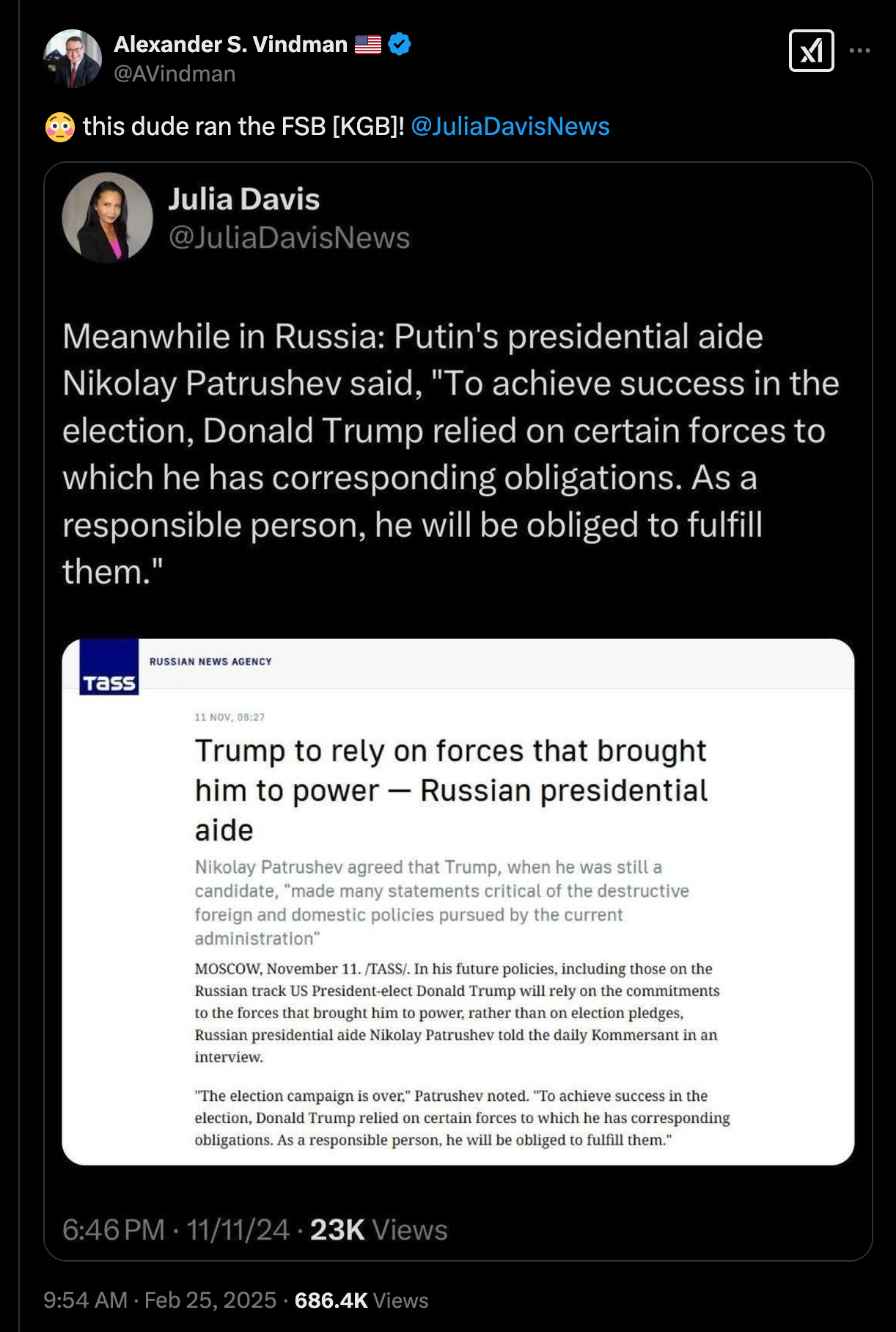 Regardless, whatever “victory” Trump achieved, even if it is technically legitimate, he certainly didn’t do it on his own, and he is now indebted to God Knows Who (Besides Elon) for it. He will be paying them back until the day he dies. And what an embarrassing thing for the former head of the FSB to say about him!