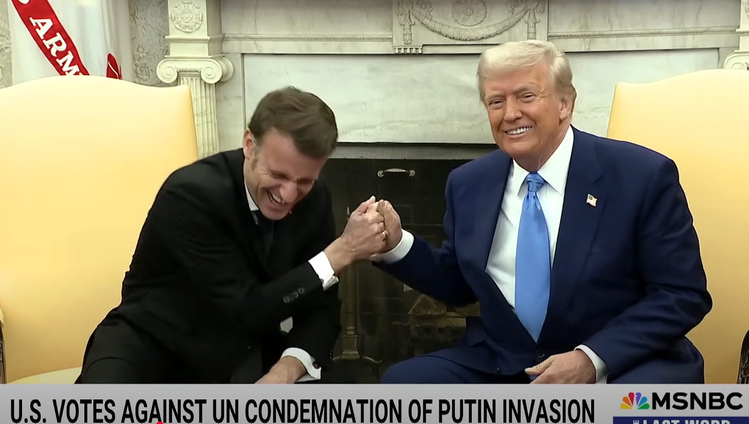 Speaking of Trump’s fucked up ideas about how our aid to allies should be subject to extortion, his wrong-ass beliefs that Europe’s aid to Ukraine has all been in loans, and his outright lie that Ukraine has been the aggressor in this war, that’s what he was talking about earlier in the week when Macron embarrassed him so much. Watch this video of leader of the free world Macron humiliating Trump on each of these points, as curated by MSNBC’s Lawrence O’Donnell. Pay particular attention to the way Macron grabs Trump’s arm like “OK, crazy American grandpa! Time to stop talking crazy talk and let the nurse change your bedpan!”