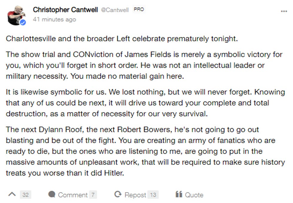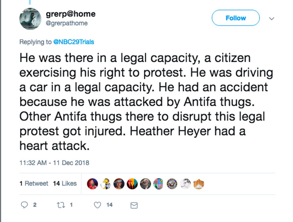 In the responses to NBC 29's tweets covering the Fields trial, and elsewhere on social media, neo-Nazi supporters are still trying to push various conspiracy theories about what really happened in Charlottesville. Despite the fact that Heyer was clearly hit by Fields's car, despite the fact that there are photos of this happening, despite the fact that Dr. Jennifer Bowers, the assistant chief medical examiner for Virginia, testified at trial that Heyer died from massive blunt force trauma after being hit with his car, the Nazis are still screaming that she really died of a heart attack.