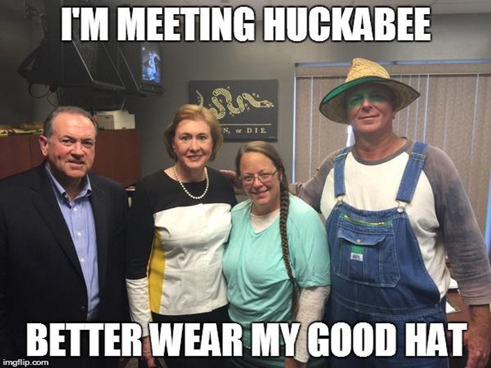 But maybe you're wondering, "Yeah, but does her husband get to have any fun on this trip?" Well, yr Wonkette doesn't know, but we're guessing that, for the right price, Old Straw Hat would be willing to 69 Mike Huckabee for religious liberty purposes. Maybe there's a market for that, on the internet. Get on it, Dogfart!