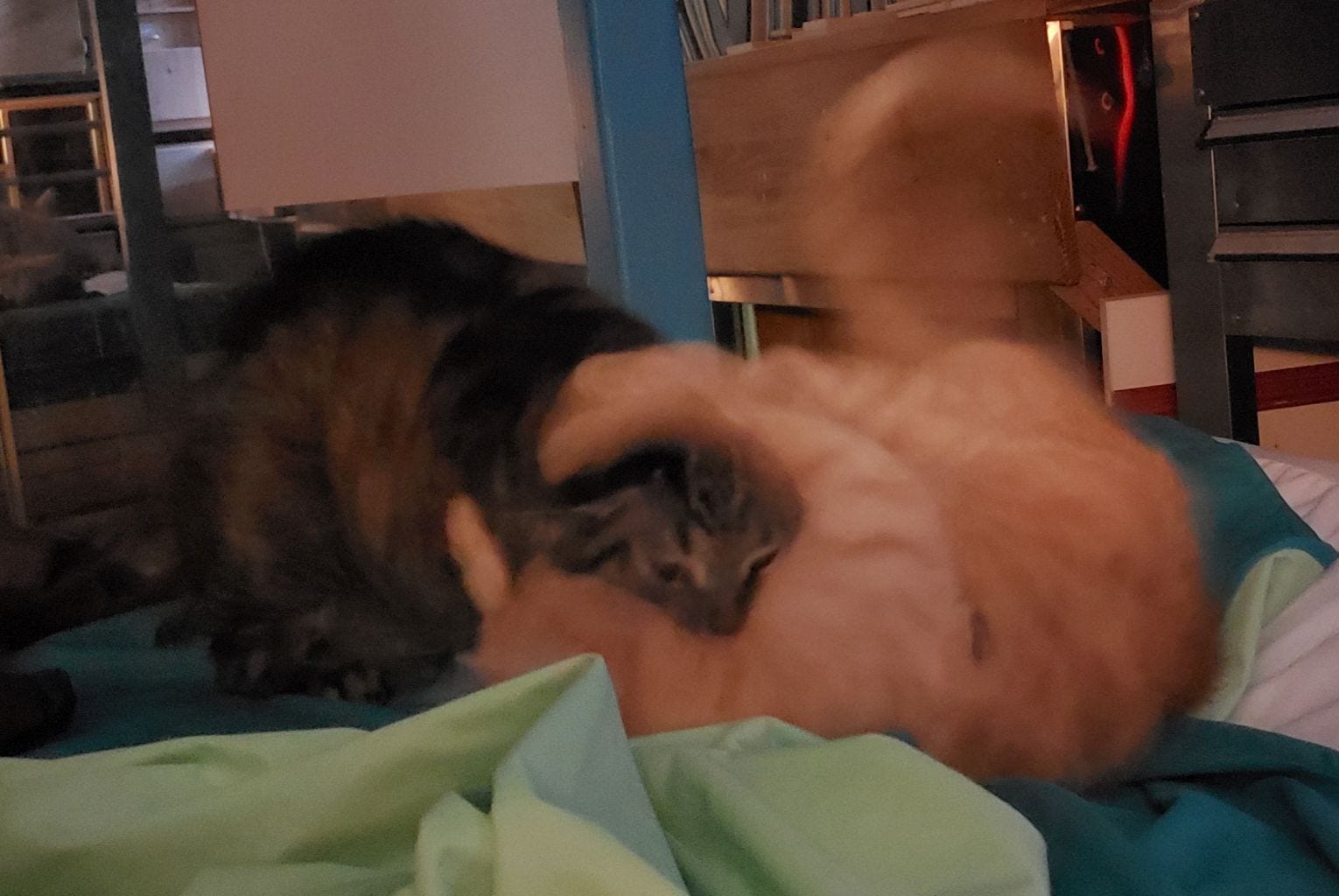 Imagine they are three times as big and playing on the bed as you try to sleep. The Crew doing this is why I'm up at this hour.