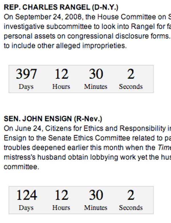 Do you know what time it is?? It is HALF PAST SERIOUS O'CLOCK, right now and forever, on the HuffingtonPost.com. Yeah, you're goddamn right someone embedded little countdown clocks that correspond to unpunished Congressional ethics violations somehow! "In the public interest, HuffPost is launching a congressional ethics clock to note the number of days (and hours and minutes and seconds) it's been since a potential ethics violation has been probed or brought to the attention of Congress's self-appointed watchdogs." Uhh, and guess what Charlie Rangel? That clock embed is going to continue to tick until there are some big BIG CHANGES around here. Mmhmm. We'll wait. [ HuffPost ]