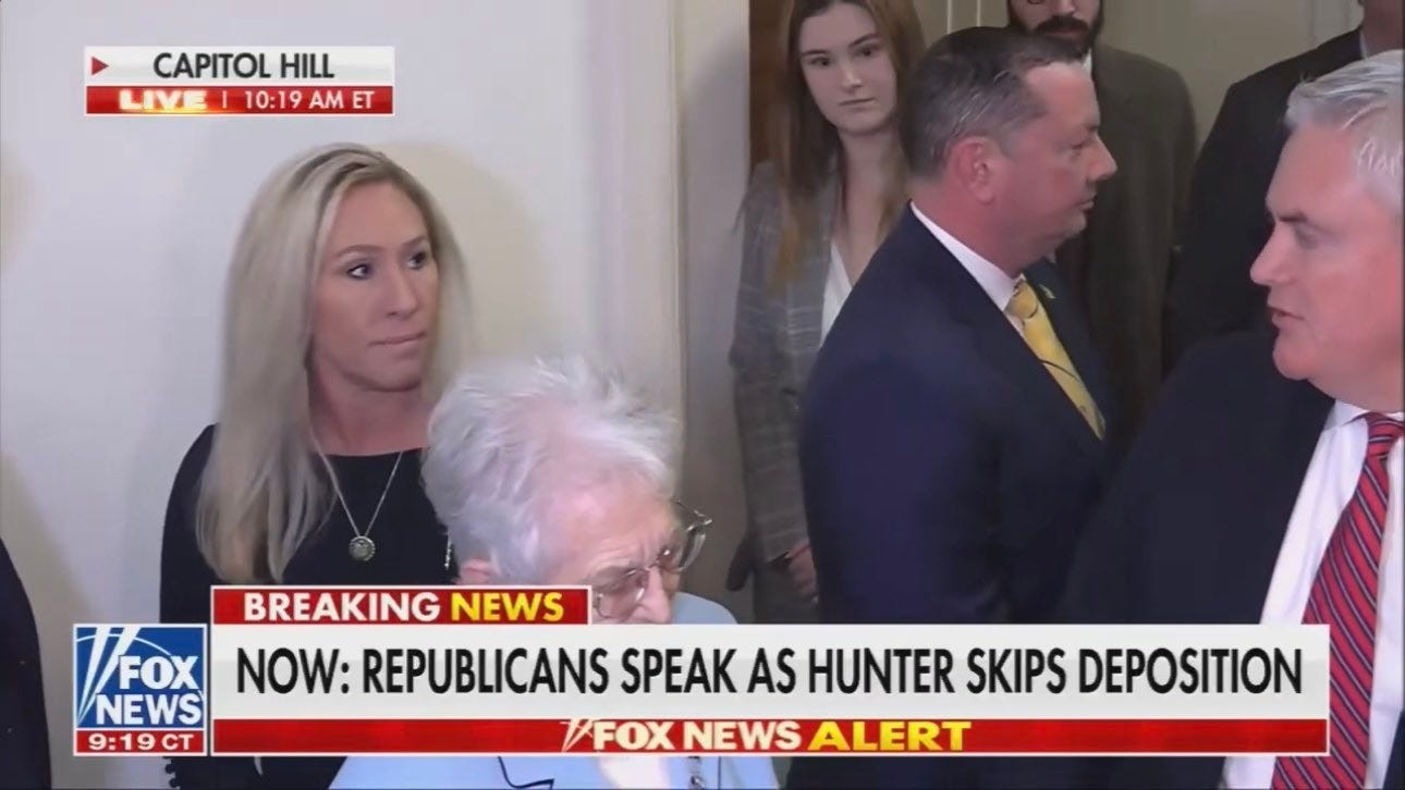 At the end of the Republicans’ presser today, Marjorie Taylor Greene chimed in to demand why nobody is asking Hunter Biden about sex trafficking. We guess that’s some stuff she learned by clicking too many pop-up ads on AOL, but even Comer looked at her like she was a moron.