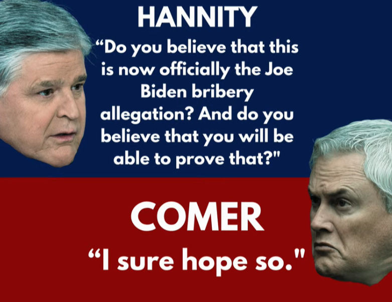 11:06: James Comer prays you don’t notice when he accuses the Bidens of “influence peddling” that he hasn’t presented actual evidence.