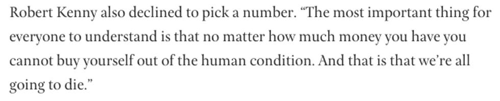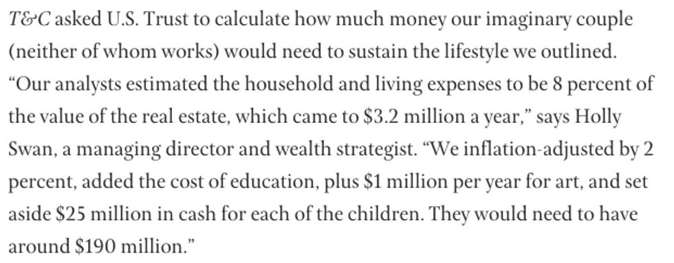 Now, those noted DSA organizers at the Woodrow Wilson School at Princeton clocked the number in at $75K a few years ago, but Town and Country is having none of this. This obviously doesn't take into account "the realm of great American fantasy. The one that makes people play Powerball. And watch Billions." (The article makes no mention, of course, that maybe one reason people play the lottery is that we live in a late capitalist hellscape where an entire generation can't afford to get a decent job much less a house or a future, while their grandparents are deciding to die to save the family the hospital bills.)