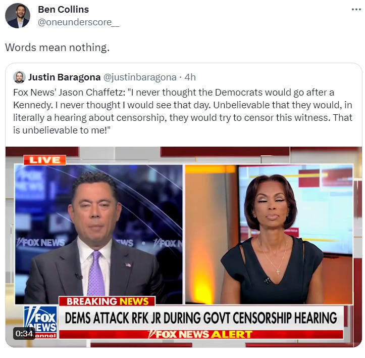 In response to the hearing, the usual braying asses at Fox News accused Democrats of “censoring” RFK Jr. In a hearing about censorship, no less!