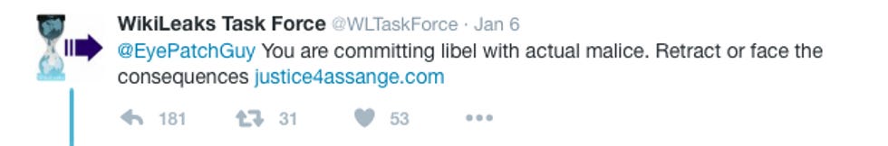 I'm going to take the opportunity to speak to WikiLeaks directly here. OK, WikiDicks, it's time to explain how American libel law works. I know you're not aware of what "libel" actually means, since to you it's "anything that says mean words about Dear Leader Poot-Poot" and "the consequences" are "being gunned down in a dark alley while Putin smirks and makes a real-life shruggie." And no, despite all the people saying so on Twitter, the reason I'm not in any way guilty of libel is not because I was "only asking a question" and "wasn't talking about Assange." I was definitely talking about Assange. Fuck that guy.