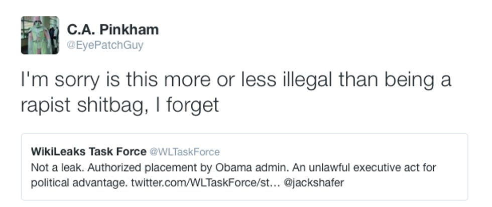 It all started when I went on Twitter (as you do) and saw WikiLeaks being EXTREMELY butt-hurt about the "illegality" of the Obama administration supposedly leaking information to NBC News. Since WikiLeaks is an organization specifically dedicated to leaking (Russian-approved) information, this struck me as a tad hypocritical, so I sent out the following tweet: