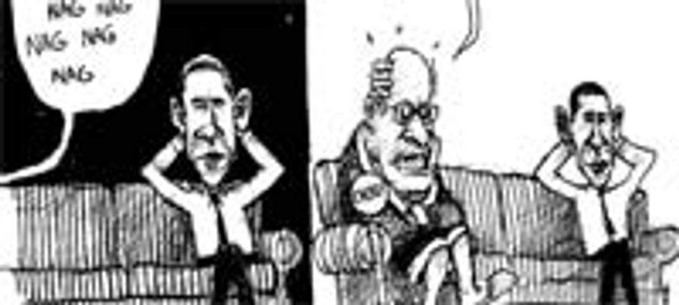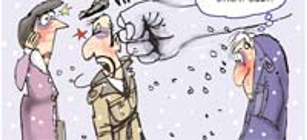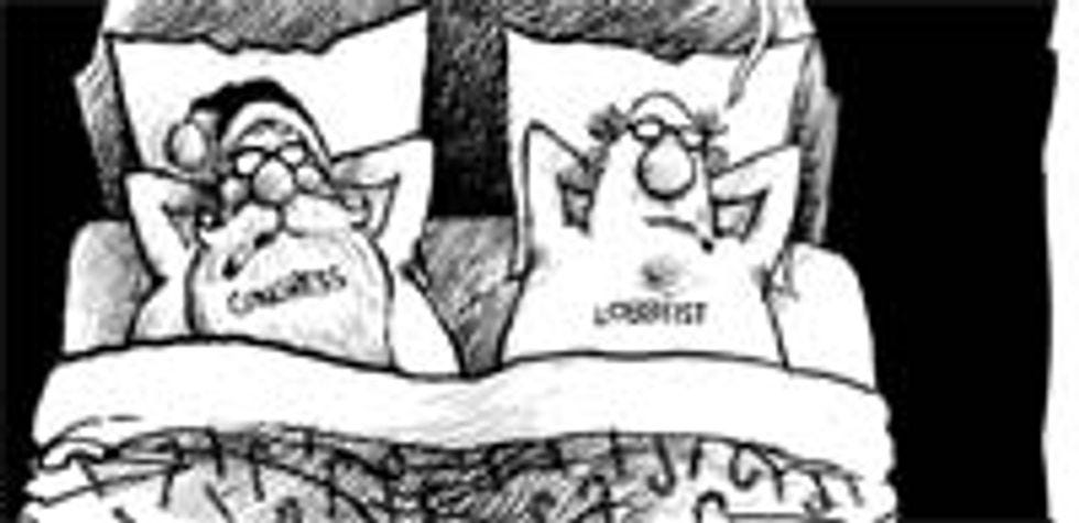 Anyway, this is just a long, roundabout way of saying that, once he had finished with his long, strenuous Christmas delivery schedule, Santa totally celebrated by bringing some nondescript bald dude back to his North Pole sex lair and just stone cold fucking him. This fellow must have been on the "extra nice" list, if he merited some sweet, sweet Santa-loving underneath the special candy cane blankets. Were the elves huddled just outside the door while all this was going on, tittering and masturbating? Was Mrs. Claus down in the kitchen, crying her eyes out as she realized the cruel double meaning of the phrase "Santa's beard"? I guess this is supposed to be about how "lobbyists" and "Congress" are metaphorically "in bed" together, though those labels are so hastily pasted on that it seems that somebody realized that his deadline was approaching and just dipped into his extensive collection of homoerotic Santa art for the day's cartoon.