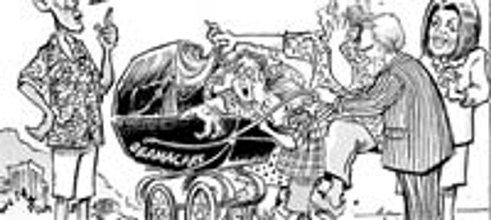 But one thing a gay couple cannot do, try as they might, is create a new human being using their naughty bits. No, that blessed task is limited to heterosexuals! Heterosexuals like Nancy Pelosi and Harry Reid, who, well, you know, lots of late nights up there on Capitol Hill, arguing about the details of health care reform, and the public option, and one thing leads to another and then, well, whaddya know, nine months later, they've produced some kind of horrifying monster with terrible claws! This is exactly the reason why we need to protect the traditional family, to make sure that we have more of these.