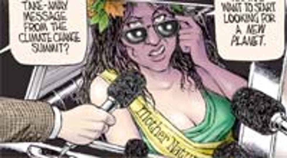 Don't blame FDR, though! The sinister cabal of weirdos who produce America's movies and television could corrupt the most saintly of individuals. Just ask Mother Nature! After making it through billions of years of history with her dignity intact, this talented earth-goddess inked a development deal with a major Hollywood studio a couple of years ago, and now look at her: wearing embarrassingly revealing clothes, huddled in the back of a limo, clearly still suffering from whatever array of mind-altering substances she indulged in last night. She pauses to snarl at the paparazzi, hating them but at the same time indebted to them for keeping her drugged-out face on the covers of the tabloids, which at this point is the only publicity she gets.