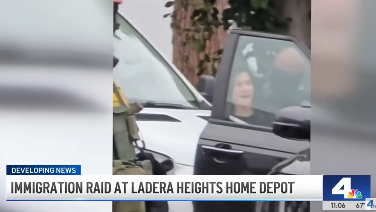 During the immigration raid at a Home Depot in Ladera Heights, in LA County, a US citizen who was shopping at the store saw agents holding a man on the ground and ran over to try to get his name and phone number in order to contact a relative. The immigration goons warned him to back off, and when the man continued to try to talk to the guy on the ground, he was tackled to the ground, tased, and arrested, because you don’t interfere with the secret police, foolish troublemaking terrorist.