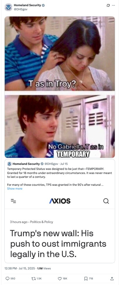 And now the administration is firing immigration court judges without cause, a thing they can do, it seems, and plans to use deputized members of the National Guard instead, to adjudicate removals that are happening as quickly as within six hours.