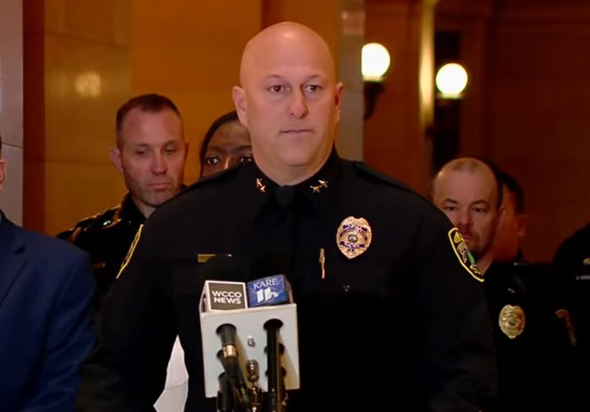 Brooklyn Park PD Chief Mark Bruley said that DHS’s “civil rights violations have to stop.” He was joined at the presser by St. Paul Police Chief Axel Henry and Hennepin County Sheriff DaWanna Witt.