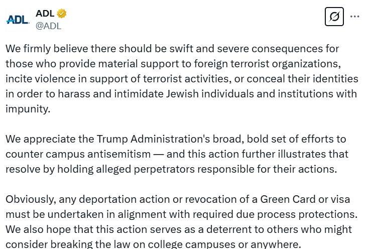 This is especially true since a significant majority of Jews in America disagrees with the government’s stance on Israel and Gaza. Is the ADL going to applaud if, say, the government whisks a Jewish green card holder from Israel or Poland or Venezuela who organizes protests against government policies off to a Louisiana detention camp?
