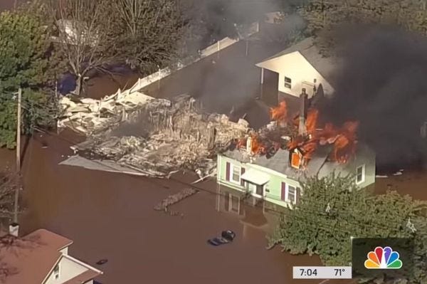 Also too, that house on fire in flood water up top, in Manville, New Jersey? Firefighters couldn't reach burning homes because of the flooded streets, and as science journalist Erin Biba notes, the area has already seen another climate disaster within the last decade: