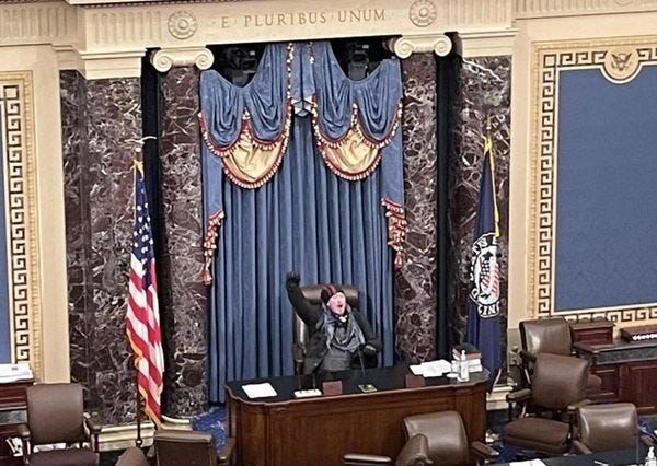 Once the insurrection got rolling, Colt found himself a real media star. The crowd he was with made it into the Senate gallery, and then he literally went over the edge, as captured by Getty photographer Win McNamee.