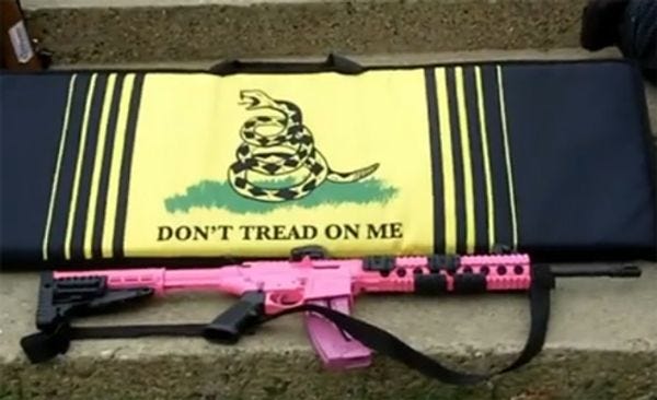 A little later, after more ranting about England and Australia's designs on our guns, Rudy and Baby and the Texas Deacon join up with some Jesus people preaching about how America has become a "sexual charged society" -- which seems a good moment (8: 30) for Rudy to insert one more still photo of his special Gadsden flag rifle case and Baby's pink AR-15. You figure that one out. Also, Rudy exclaims "Amen" to the preacher's suggestion that JFK probably went to hell because he wasn't saved. So: Guns, excellent; lust, bad. Hey, that actually sounds strangely familiar!