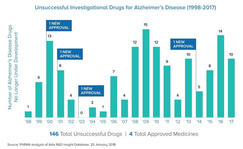 From 1997 to 2017 the biotech/pharma industry had 146 failed clinical studies in AD. Now, not all were big Phase III studies like the recent Biogen failure (1300 patients!), but man , that's a desert of drug development! In 2018 there were another six big Phase III failures. All of these are going after the two approaches I mentioned early in the story and that's pretty much the guy looking for his car keys under the lamp because "that is where the light is." Rather than spending those hundreds of millions (probably billions by now) on basic research to learn more about AD pathophysiology and come up with a new approach, pharma keeps swinging and missing. After the massive failure and $20 billion loss in value, Biogen did decide to move on, but want to know what Eisai, their partner is planning next? ANOTHER big Phase III study with the same drug. FFS!