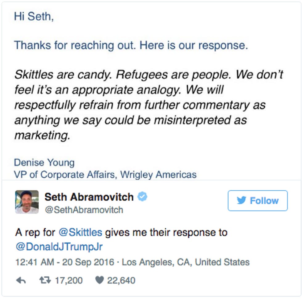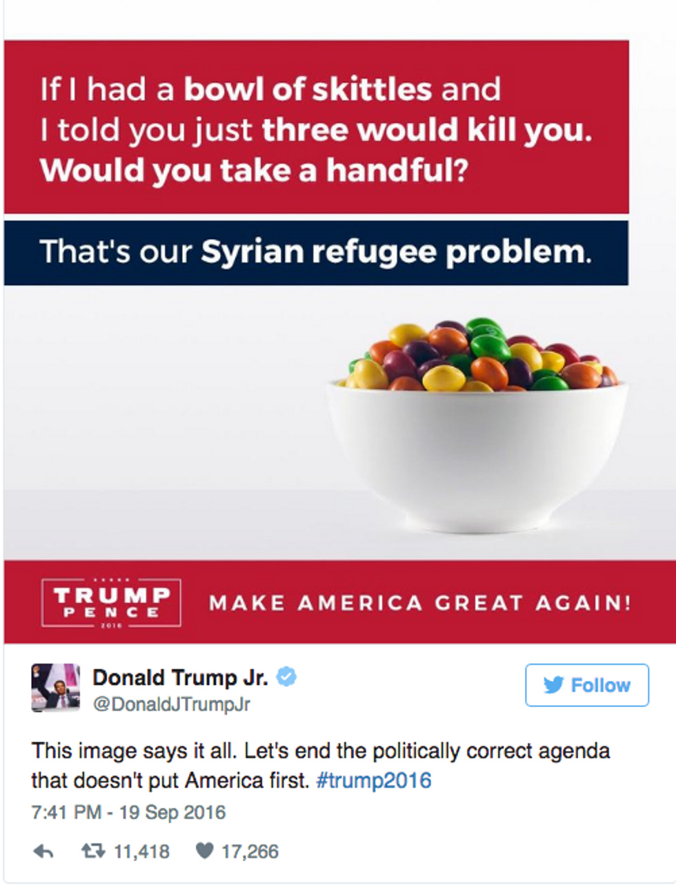 Last night, Donald Trump Jr. sparked a whirlwind of disgust after posting a meme comparing Syrian refugees to Skittles that might be poisoned.