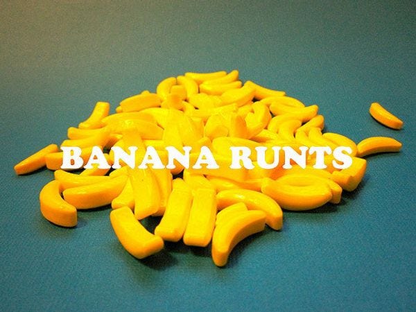 No one knows why banana-flavored Runts exist, but we are all collectively pretty mad about it. They're gross and they taste like soap, and the only upside to them is that they are uniquely shaped enough that you won't accidentally eat one in a dark movie theater. Also they are small and yella.
