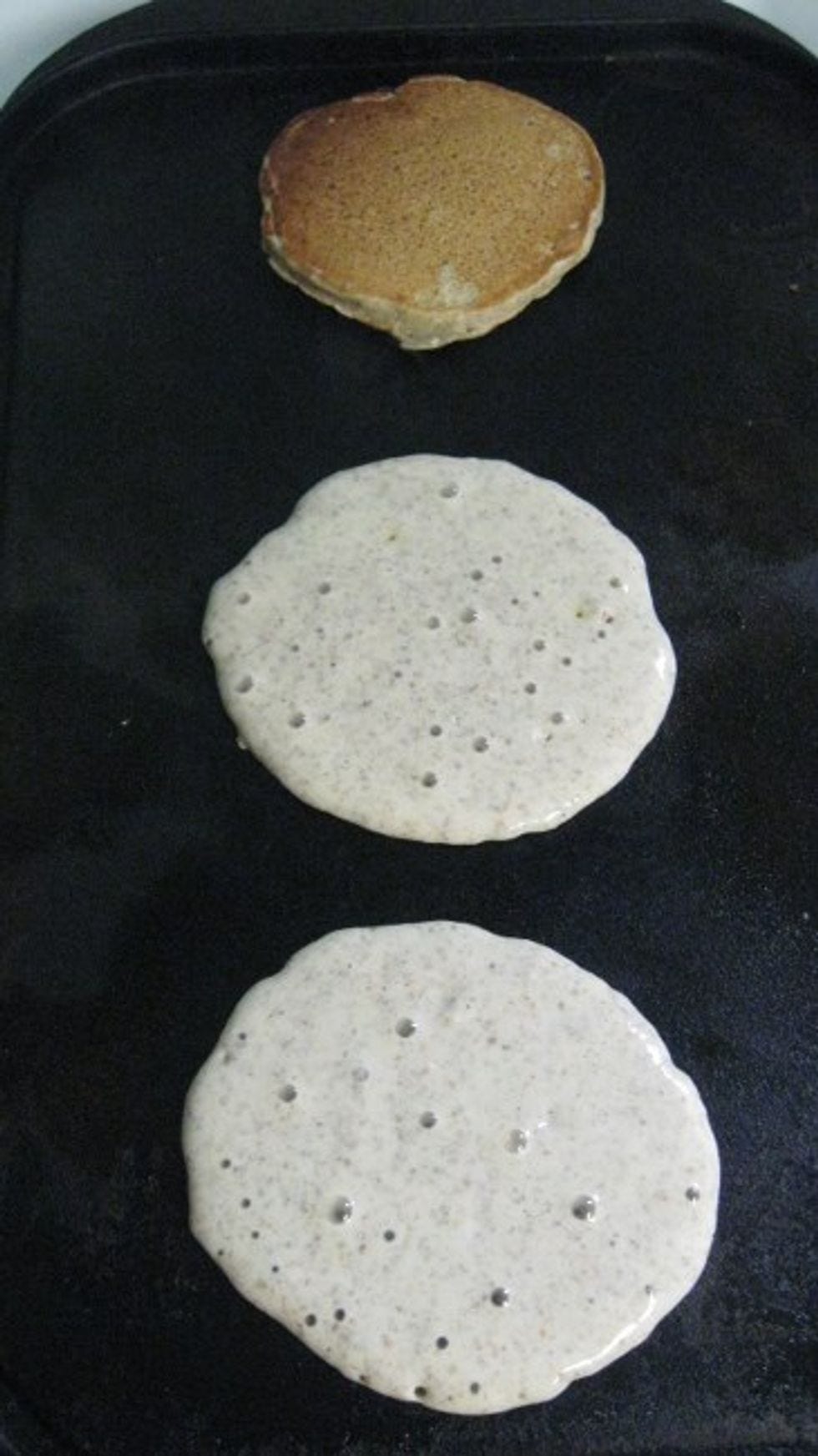 Ladle the batter onto the griddle. When there are a lot of little bubbles and/or you see the edges of the pancake start to get dry, flip it. Cook for another minute or two. Then stack them on a plate in the oven set to warm (175 F degrees).