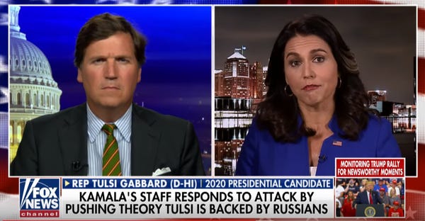 NBC News did some analysis a while back and found that "the main English-language news sites employed by Russia in its 2016 election meddling show Rep. Tulsi Gabbard of Hawaii ... has become a favorite of the sites Moscow used when it interfered in 2016." It went on: