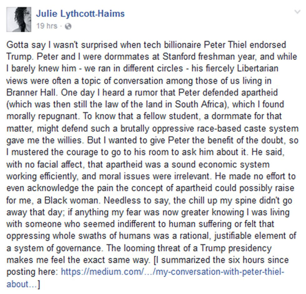 Lythcott-Haims says she wasn't the only person young Thiel defended Apartheid to in the dorm, and suspects others may come forward -- or not. Mostly, she's disappointed to find out Thiel is apparently as unfamiliar with empathy today as he was back then: