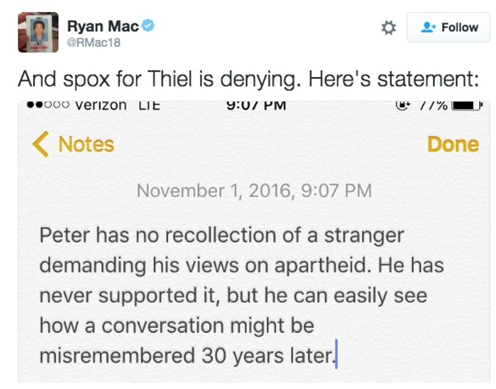 If Thiel said it -- and we have no reason to doubt Lythcott-Haims's account -- it certainly wouldn't have been outside the Libertarian/conservative mainstream at the time. Ronald Reagan loved the good anti-communist government of Apartheid South Africa, and letters to the editor constantly pointed out that the African National Congress was a commie terrorist organization, and people organizing boycotts and disinvestment campaigns against the Apartheid government were useful idiots playing into the hands of International Communism, just because the South African government slaughtered some protesters now and then. The only mild surprise is that Thiel is politically savvy enough today to deny having ever held what was once a majority conservative Republican view.