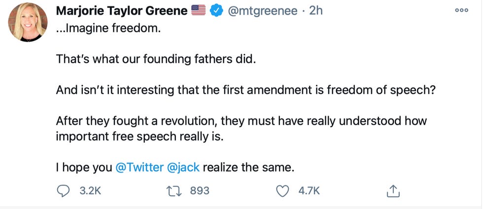 One more time: The First Amendment states that Congress should make no law abridging freedom of speech. Twitter isn't a member of Congress, but unfortunately Greene is. She's also an anti-Muslim bigot who described the 2018 “blue wave" midterms as "an Islamic invasion of our government." She probably forgot the freedom of religion part of the First Amendment. Or maybe not. Greene, like so many conservatives, believes the Constitution only protects her rights — her freedom of speech, her religious liberty, her freedom to peacefully assemble.