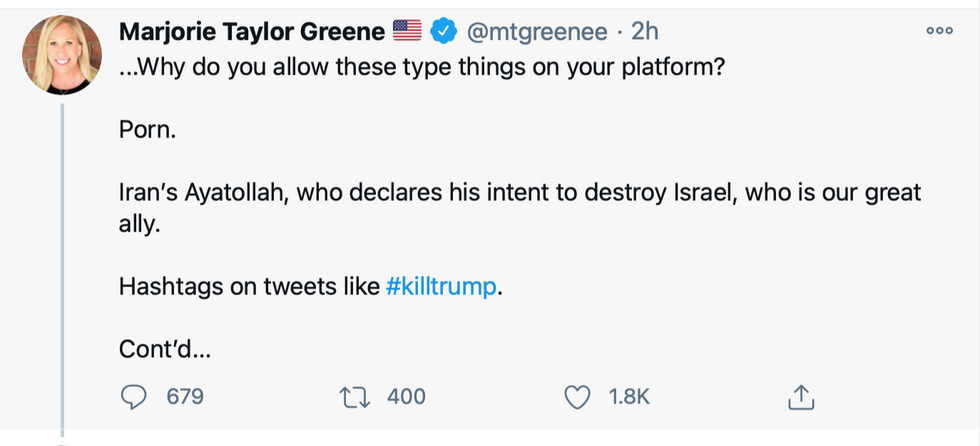 This is still not how free speech works. It's also absurd that Greene, who literally posed with an assault rife in a campaign ad, claims that Twitter is the one “playing a very big role in the dangerous divide of Americans." Greene is hardly Ms. Unity.
