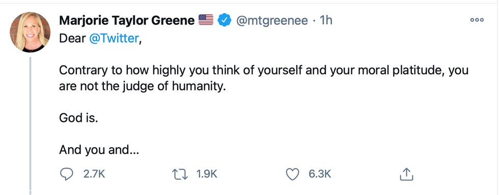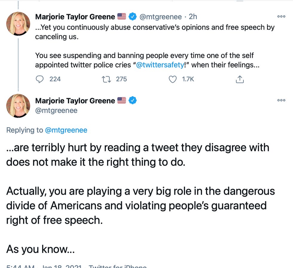 Twitter isn't a public service, so Comrade Greene here has no inherent right to its platform. Twitter could literally ban all Republicans and if Green ran crying to Ayn Rand, her moldering corpse would tell her to form her own social media site. That's how the free market works. Also that is not how the word "platitude" works.