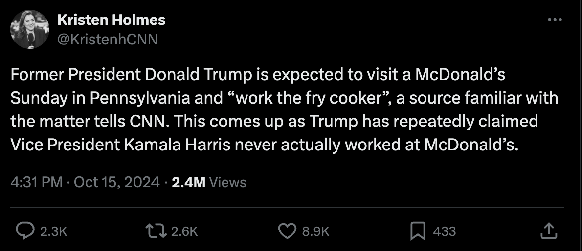 And he’s doing this because he’s obsessed with the fact that Kamala Harris had a summer job at McDs one time very long ago, working on the fryer, specifically. He does not believe she had a summer job at McDs one time very long ago. Why? Probably because he doesn’t understand that actual human beings have jobs working at actual McDs, certainly not human beings who one day run for president, so it must be a lie.