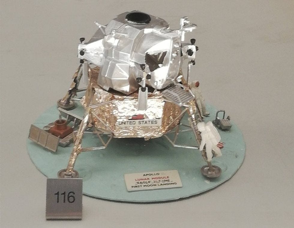 It's a commercial model kit of the Apollo 11 lander on the moon, with this explanatory sign: