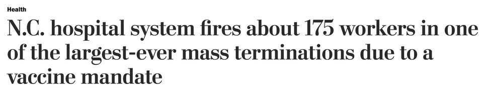 Oh, no, it's a bloodbath ... if just 200 people work in the North Carolina hospital system. The 175 workers who were fired account for barely 1 percent of the system's roughly 35,000 employees. Most unvaccinated workers chose to comply with the mandate because mandates are effective at picking up where common sense left off.